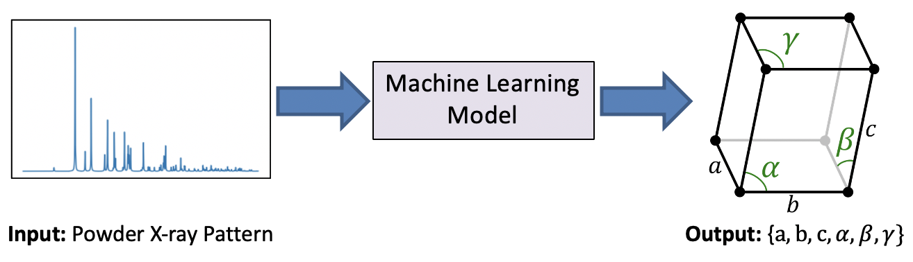 In this project, we develop supervised learning models to predict the shape of the unit-cell of a crystal from simulated data as well as experimental data collected at the Stanford Synchrotron Radiation Lightsource (SSRL). As shown in the image above, the unit-cell shape is fully defined by six numbers, three lengths and three angles, and therefore this problem can be formulated as a standard non-linear regression task with six outputs. Please check out our publication for more information.